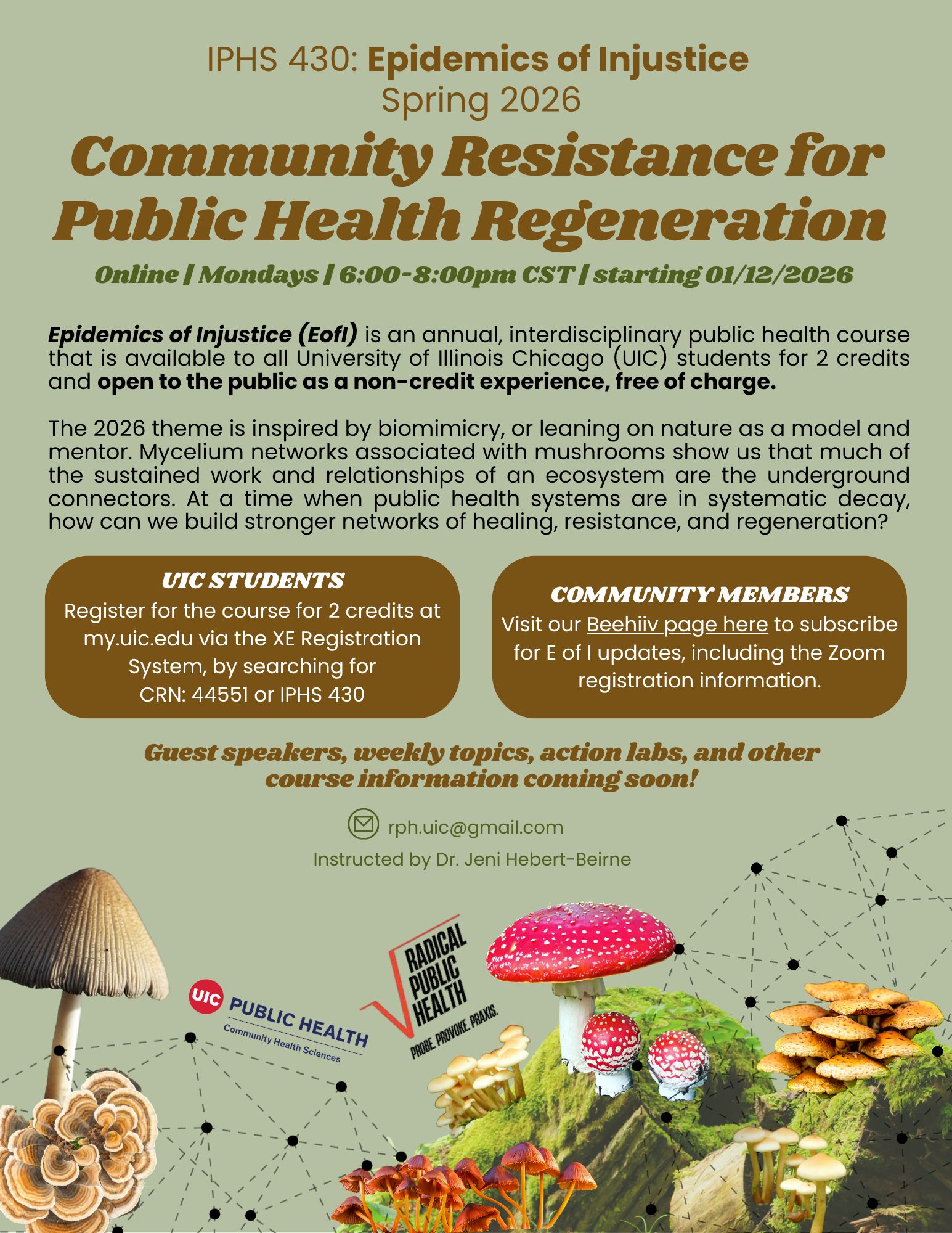 We’re thrilled to announce our Spring 2026 course theme: Community Resistance for Public Health Regeneration. This theme is inspired by mycelium networks in nature and by the community networks that many folks are creating to share resources and keep each other safe in these times.