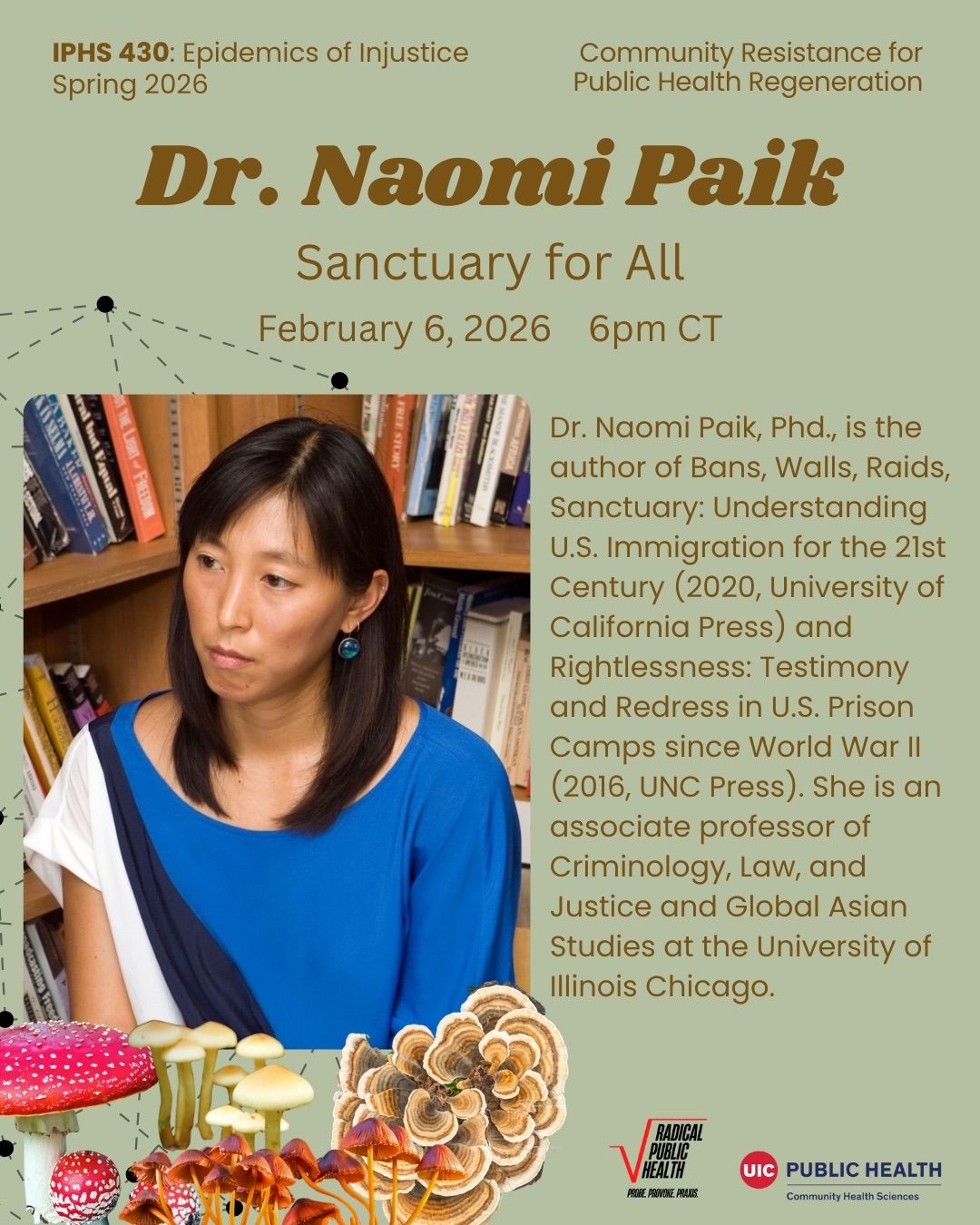 Dr. Naomi Paik, Phd., is the author of Bans, Walls, Raids, Sanctuary: Understanding U.S. Immigration for the 21st Century (2020, University of California Press) and Rightlessness: Testimony and Redress in U.S. Prison Camps since World War II (2016, UNC Press; winner, Best Book in History, AAAS 2018; runner-up, John Hope Franklin prize for best book in American Studies, ASA, 2017), as well as articles, opinion pieces, and interviews in a range of academic and public-facing venues. Her next book-length project, “Sanctuary for All,” calls for the most capacious conception of sanctuary that brings together migrant and environmental justice. A member of the Radical History Review editorial collective, she has coedited four special issues of the journal—“Militarism and Capitalism (Winter 2019), “Radical Histories of Sanctuary” (Fall 2019), “Policing, Justice, and the Radical Imagination” (Spring 2020), and “Alternatives to the Anthropocene” (Winter 2023). She co-edits the “Borderlands” section of Public Books alongside Cat Ramirez, as well as “The Politics of Sanctuary” blog of the Smithsonian Institution with Sam Vong. She is an associate professor of Criminology, Law, and Justice and Global Asian Studies at the University of Illinois Chicago, and a member of the Sanctuary Campus Network, Sanctuary for All UIC, the Migration Scholars Collaborative, and Faculty and Staff for Justice in Palestine, UIC. Her research and teaching interests include critical ethnic studies; U.S. imperialism; U.S. militarism; social and cultural approaches to legal studies; transnational and women-of-color feminisms; abolition; carceral spaces; and labor, race, and migration.